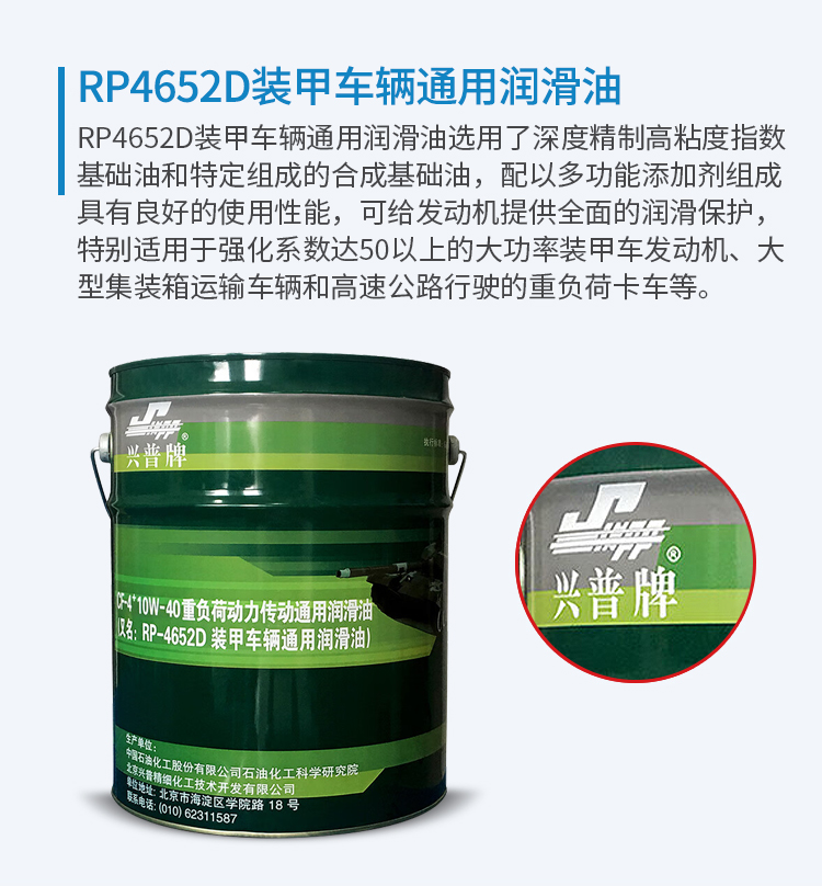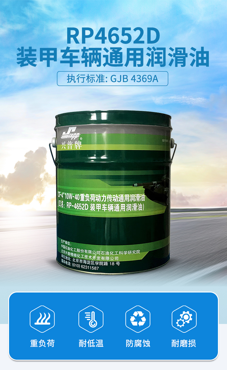 RP4652D裝甲車輛通用潤滑油,符合國軍標GJB 5038 - 2003執行標準。廣泛用于軍用重卡/裝甲運兵車/坦克/步兵戰車等車型的重型柴油機上。
