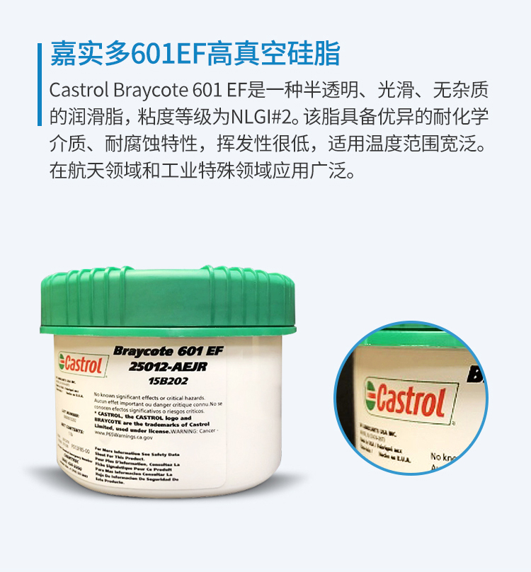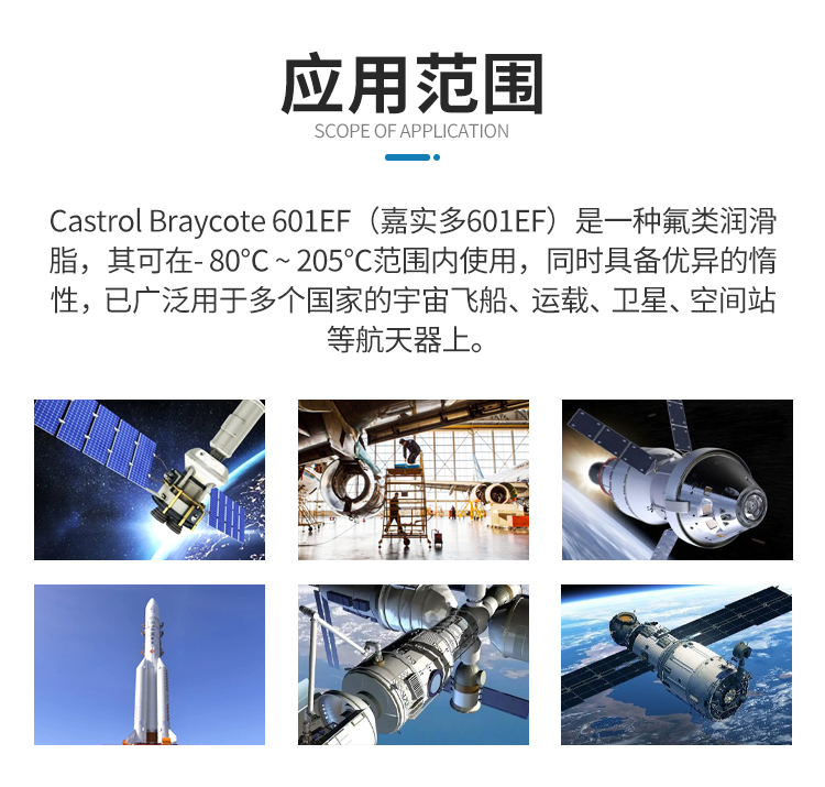 油脂簡述:Castrol Braycote 601EF(嘉實多601EF)是一種氟類潤滑脂,其可在- 80℃ ~ 205℃范圍內使用,同時具備優良的惰性,已廣泛用于多個國家的宇宙飛船、運載火箭、衛星、空間站等航天器上。"/>