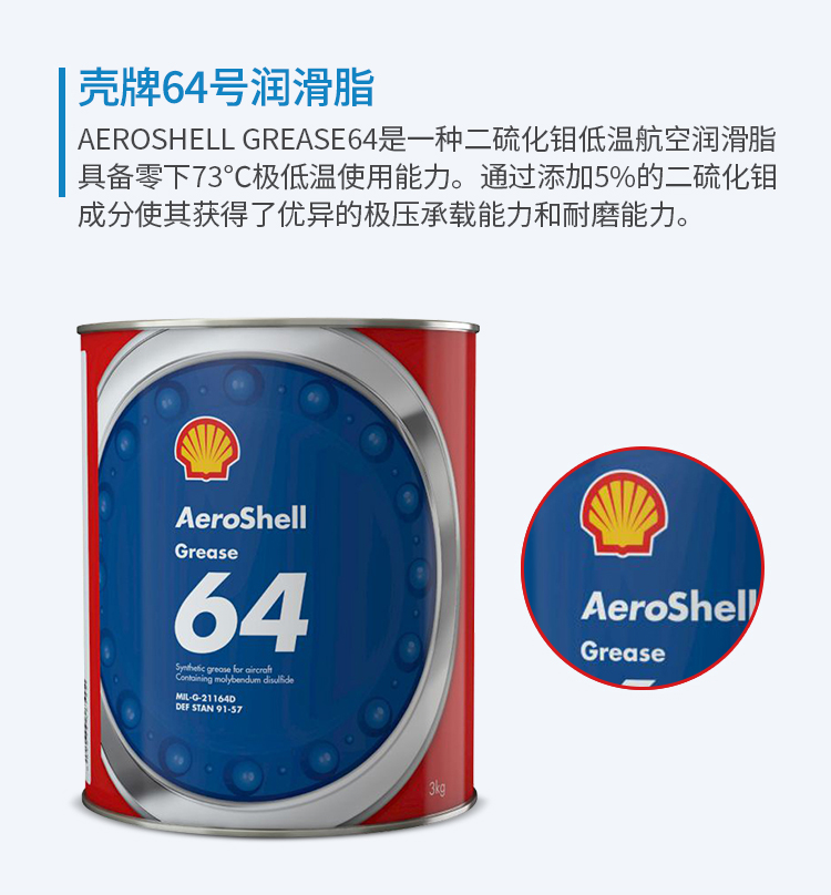 油脂簡述:AeroShell Grease 64是一種二硫化鉬低溫航空潤滑脂。它具備零下73℃極低溫使用能力。殼牌64號通過添加5%的二硫化鉬成分使其獲得了優異的極壓承載能力和耐磨能力。該脂廣泛應用于各類軍、民、通航飛機上。"/>