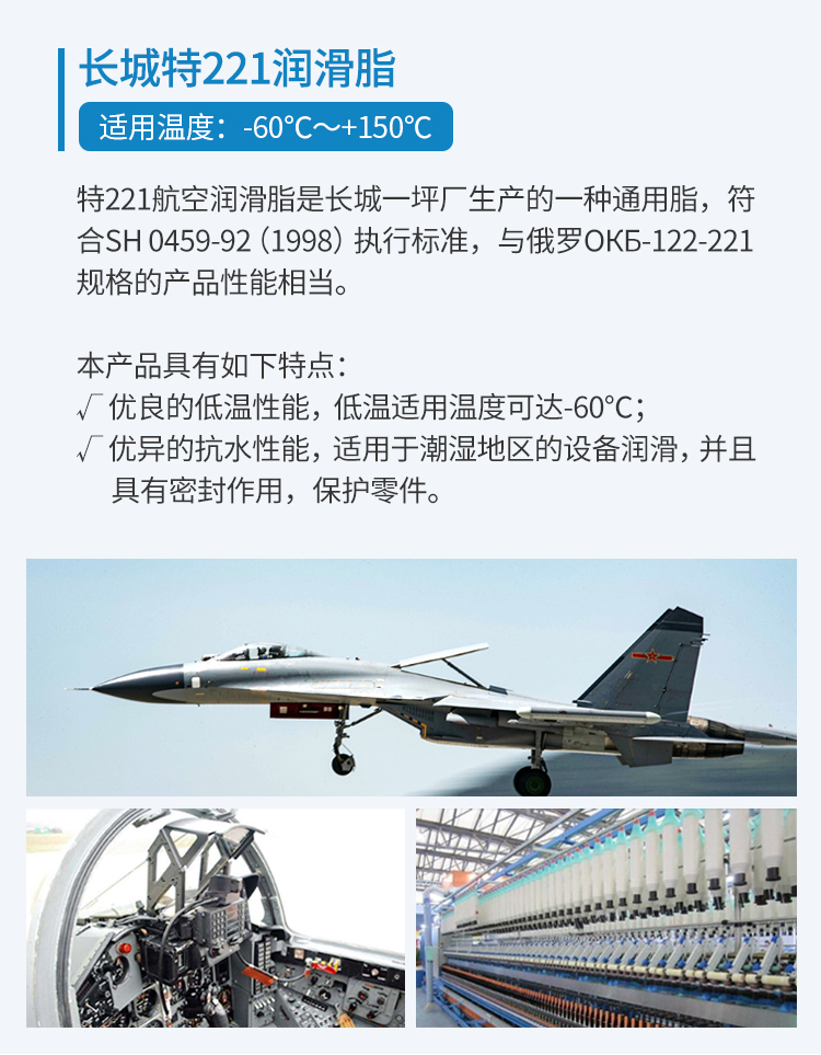 特221航空潤滑脂是長城一坪廠生產(chǎn)的一種通用脂,符合SH 0459-92(1998)執(zhí)行標(biāo)準(zhǔn),具有抗水性,適用于潮濕地區(qū)設(shè)備的潤滑。本產(chǎn)品是采用復(fù)合稠化劑稠化合成油精制而成的潤滑脂。