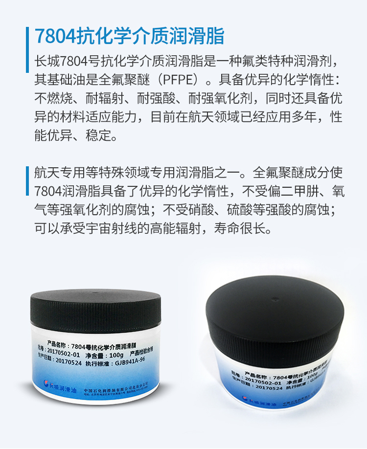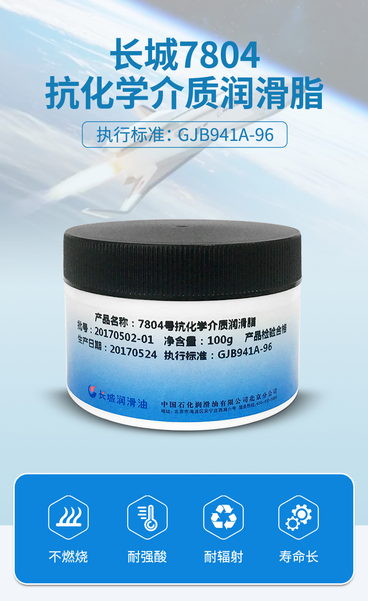 航天專用等特殊領域專用類潤滑脂之一。全氟聚醚成分使7804潤滑脂具備了優異的化學惰性,不受偏二甲肼、氧氣等強氧化劑的腐蝕;不受硝酸、硫酸等強酸的腐蝕;可以承受宇宙射線的高能輻射,壽命很長。