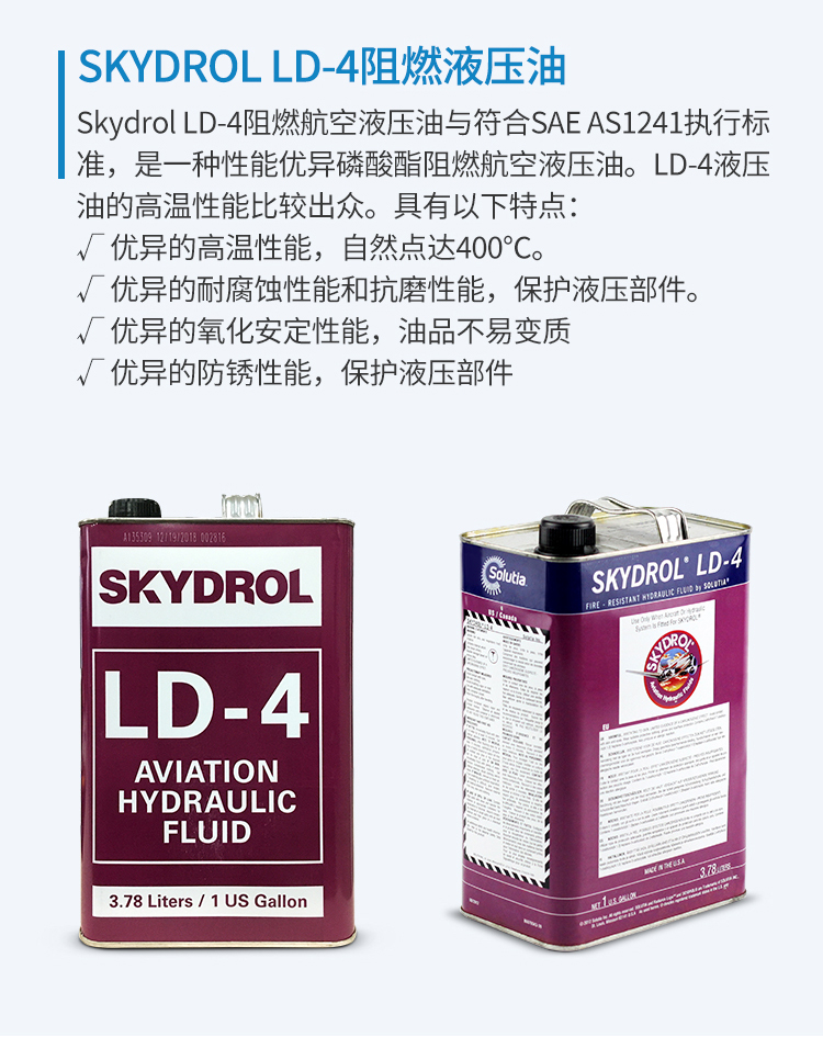 除了Skydrol LD-4之外,河南航材還能為您提供符合AS 1241 V類標(biāo)準(zhǔn)的Skydro 5、Skydrol PE-5型阻燃液壓油,歡迎致電選購!