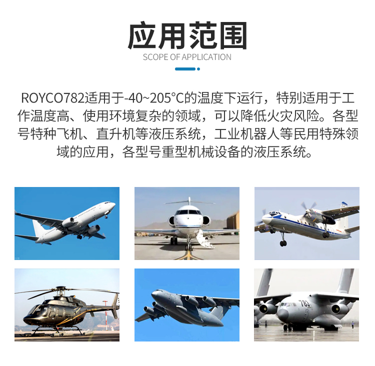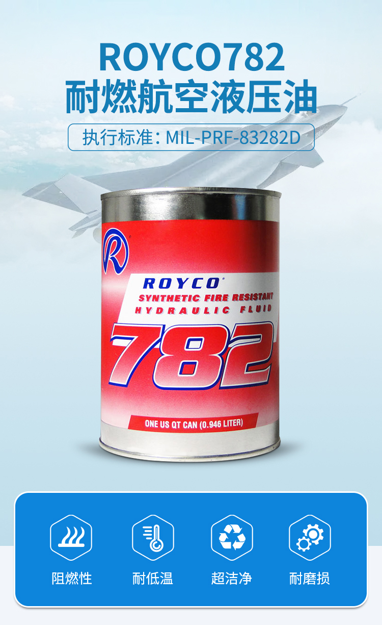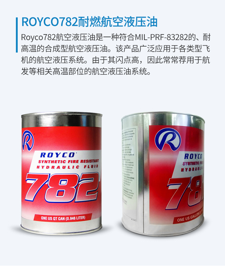 Royco782航空液壓油是一種符合MIL-PRF-83282的、耐高溫的合成型航空液壓油。該產(chǎn)品廣泛應(yīng)用于各類(lèi)型飛機(jī)的航空液壓系統(tǒng)。由于其閃點(diǎn)高,因此常常薦用于航發(fā)等相關(guān)高溫部位的航空液壓油系統(tǒng)。